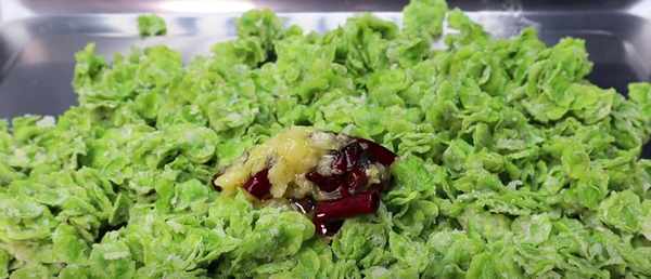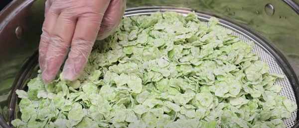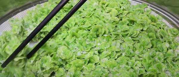 8、时间到了,马上打开锅盖,别让它满锅,从锅里拿出来,榆钱的颜色还是绿色的,用它拉。筷子输榆钱。