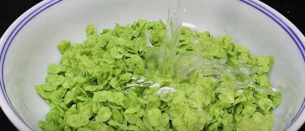 2、处理好的榆钱放在一个大碗里,加一撮盐,一撮小苏打,再加入没过榆钱的清水,把榆钱洗干净,因为榆钱涨起来了。树上会有很多灰尘和虫卵,所以吃之前一定要洗干净。