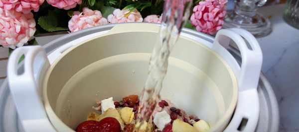 3、现将除枸杞以外的所有材料倒入小锅中,加入适量的水,用文火煮1小时50分钟。