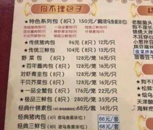 这些包子是狗不理的经典,哪怕再贵点。为什么连那些小菜都能成为“贵族”?一盘花生米58元,一杯豆浆也能卖到48元。