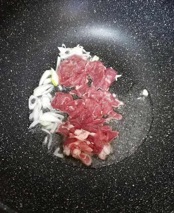 5、 油热后放葱花和蒜片炒香,随后放肉片