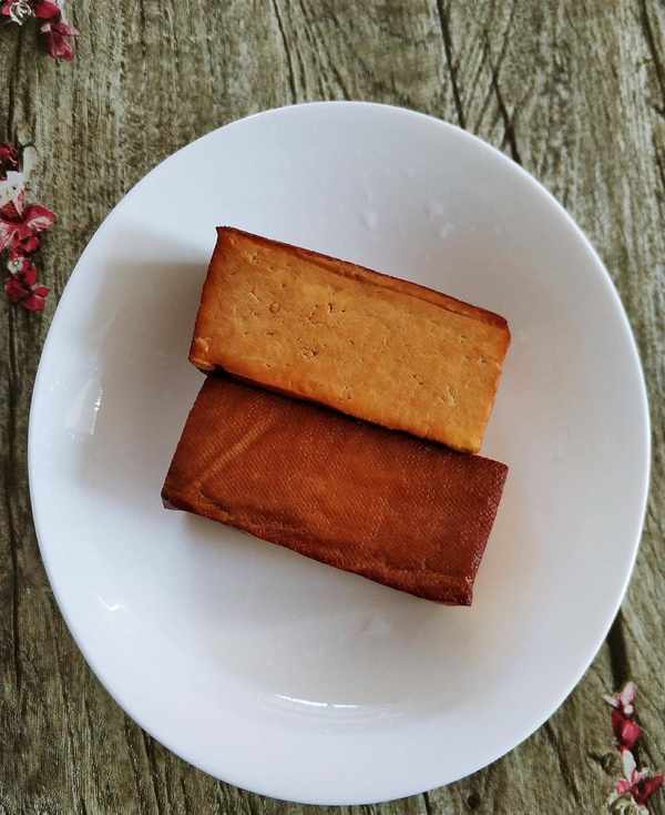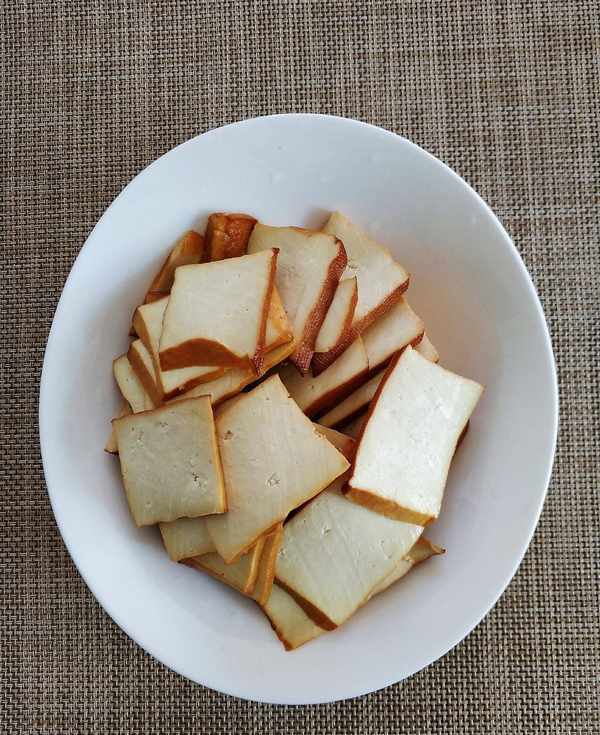 2、 香干切薄片备用,我选用的熏干也很好吃