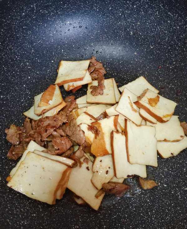6、 猪肉炒制变色后放入生抽,翻炒十多秒后,放入切好的香干炒制1、2分钟
