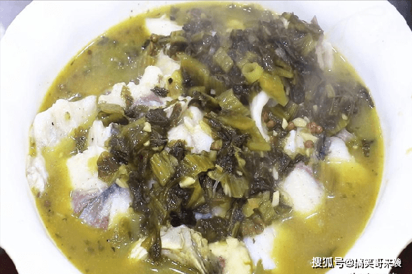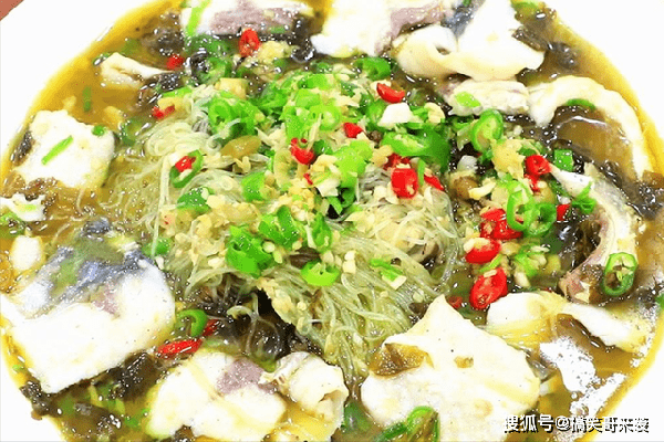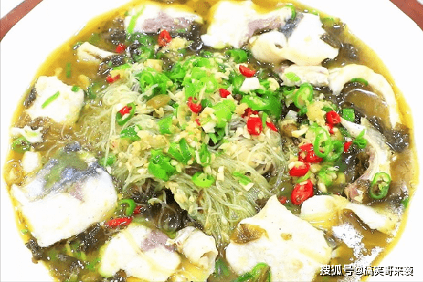 5分钟以后把粉丝放入酸菜汤中,烫10秒钟立即关火,然后把鱼头酸菜汤浇在鱼片上面,鱼片会被热汤再次加热成熟、肉质会非常细嫩。