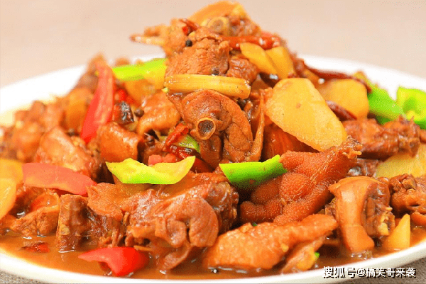 土豆削去外皮,切成滚刀块;青红椒切成菱形片、为菜品增色;大葱切成段,生姜切成片,大蒜拍扁放在一起,抓入几粒八角,一小撮花椒、一小撮麻椒备用。
