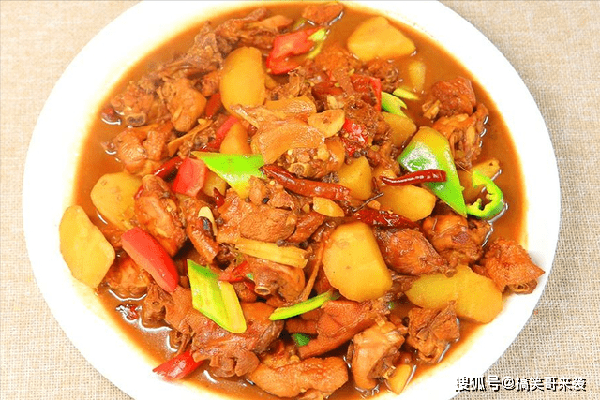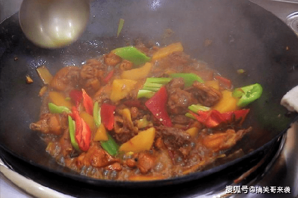 鸡块大约炒至7成熟,露出骨头以后倒入土豆块,加入料酒、食盐、十三香翻炒均匀,再倒入适量的清水,大火烧开以后打去浮沫,然后转大火收汁,汤汁逐渐变得浓稠、土豆非常软绵时倒入准备好的青红椒, 继续炖煮一会儿。