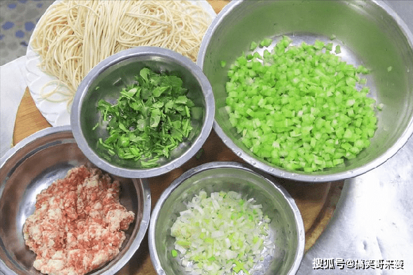 西芹洗干净、撕掉老筋,破开、切成丁;五花肉300克剁成肉末;葱白破开、切成葱粒,香菜切成小段;再准备适量的现轧圆面条备用。