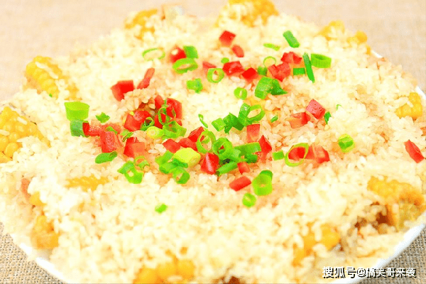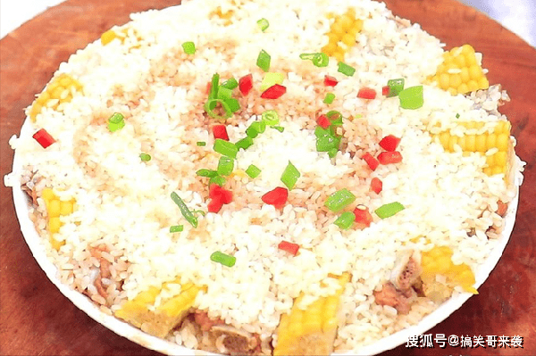 20分钟以后鲜香美味的玉米排骨焖饭就能出锅了,最后撒上葱花和红椒粒,即可享用。