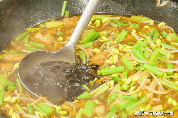 五花肉切成片, 黄豆芽淘洗干净, 芹菜洗净切成小段,另外切点葱圈、 姜片用来爆锅。锅热烧油,放入几粒八角 、一小把花椒,小火炸香后捞出来,然后把肉片放进去煸炒出香味,再淋点老抽上色,放黄豆芽、芹菜炒上一会,舀进去两碗水,加盐、 味精、 十三香、 生抽,把汤调得稍微咸一点,大火烧开以后把菜捞出来, 菜汤留着拌面。