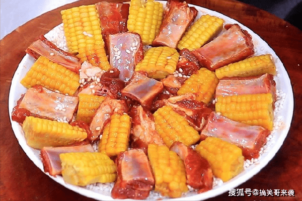 3.糯米泡胀以后把水分沥干平铺在盘子上,交替着摆上排骨和玉米,把剩余的糯米铺上排骨上面,再浇上腌排骨的料汁,蒸锅中上大气以后把