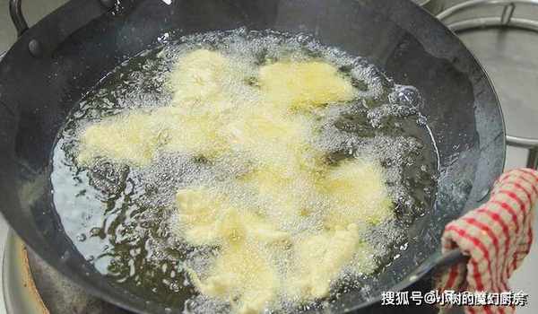 下面我们把肉片过油炸一下,锅内烧油,油温5成热(微微冒烟)时,把裹好的肉片一片一片放入锅内。(一起下锅容易粘在一起)