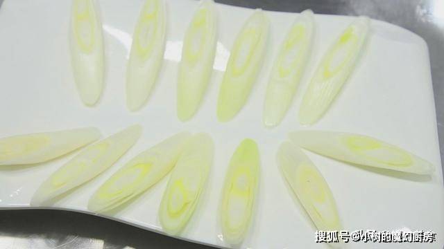 肉片腌制这段时间,我们把刚才切好的大葱白摆放在盘中。