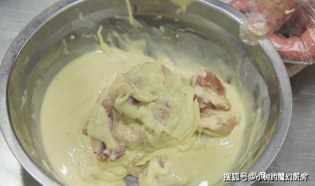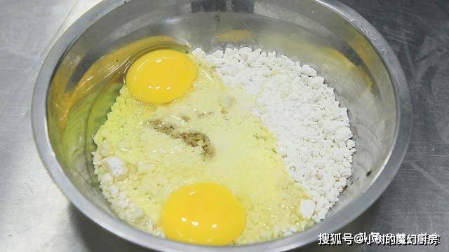 ,打入两个鸡蛋。(红薯芡融于水中加热后会呈现粘稠状,特性要比一般的淀粉更加粘稠,炸出来的食品更有脆感)