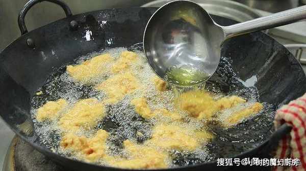 肉片下锅后,用勺子轻推,有粘连在一起的要打散。炸2分钟左右,炸至定型后,捞出控油。