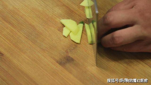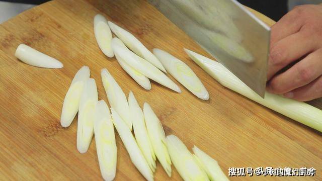 大葱白两段切成斜刀片。