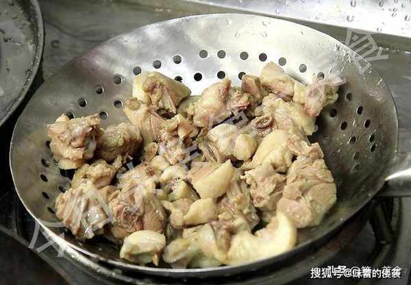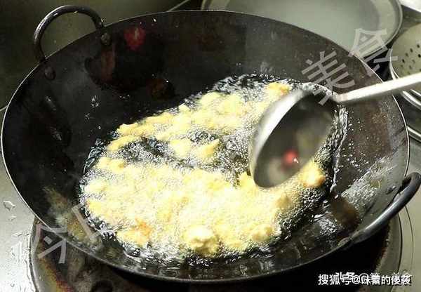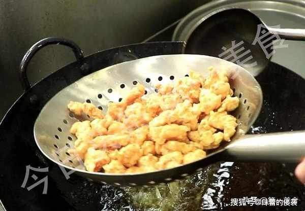 锅内烧油,油温五成热,油面轻微冒烟时起锅,把鸡丁一个一个放入锅中避免粘在一起,这一步的目的是防止前后下入的鸡丁色泽和生熟不一,鸡丁下完以后把锅放在火上,保持小火,大约炸制3分钟,炸出鸡丁中的水分,鸡丁定型以后捞出。