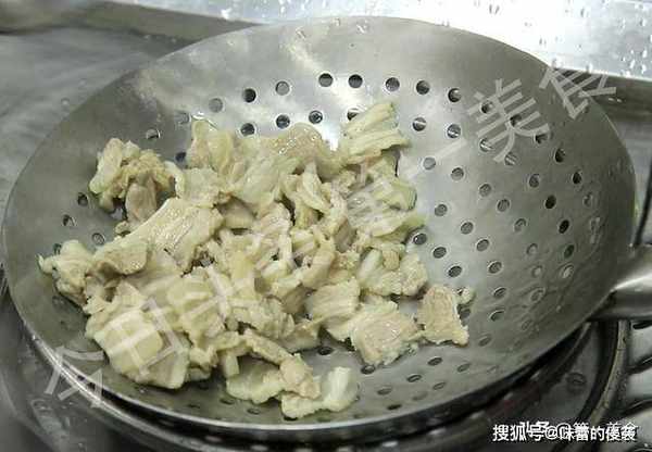 入底味,把肉片放入锅中快速搅散,让其均匀受热,逐渐加热的过程中国五花肉会析出血水,水烧开以后打去锅中的浮沫,焯水2分钟左右,肉片变白以后倒出来用清水冲洗干净,控水备用。