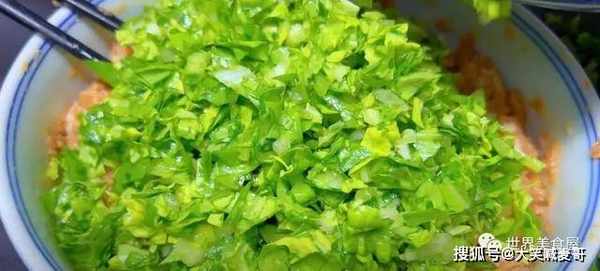 1、首先将白菜切碎,只要叶子不要梗。加入两勺花生油搅拌,可以锁住水分,吃起来更鲜。