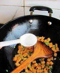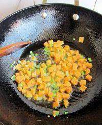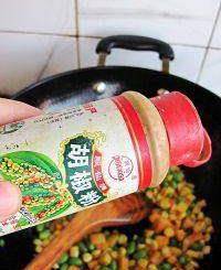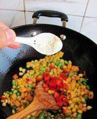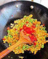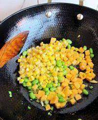 8.然后加入青豆,玉米粒淋入少许清水继续翻炒片刻。