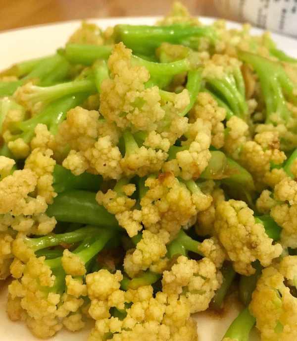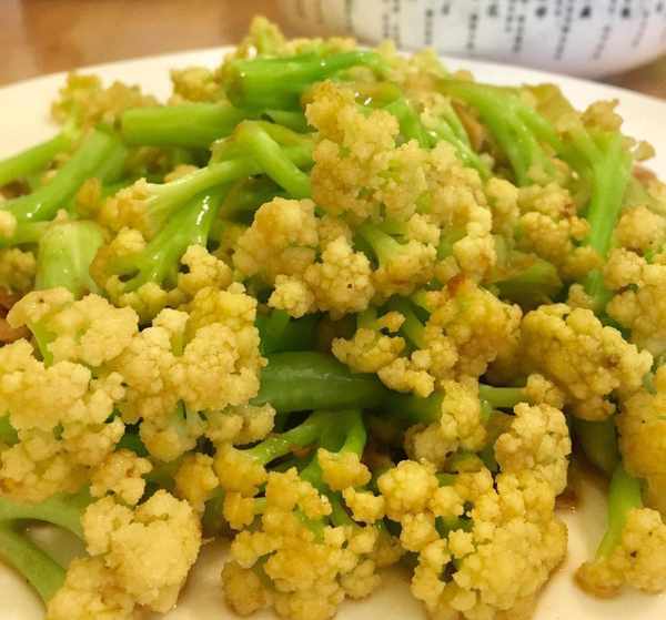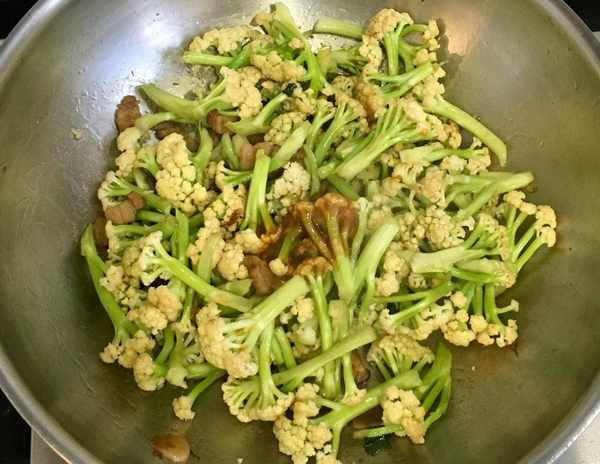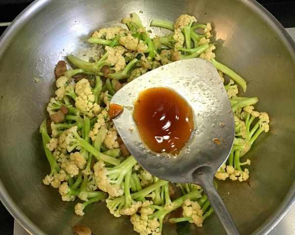 倒入花菜翻炒均匀,并且断生后加入适量的蚝油继续翻炒均匀
