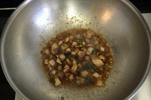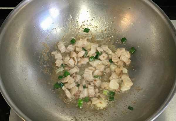 热锅加入适量的花生油把五花肉片炒出香味,放入葱花、蒜片爆香