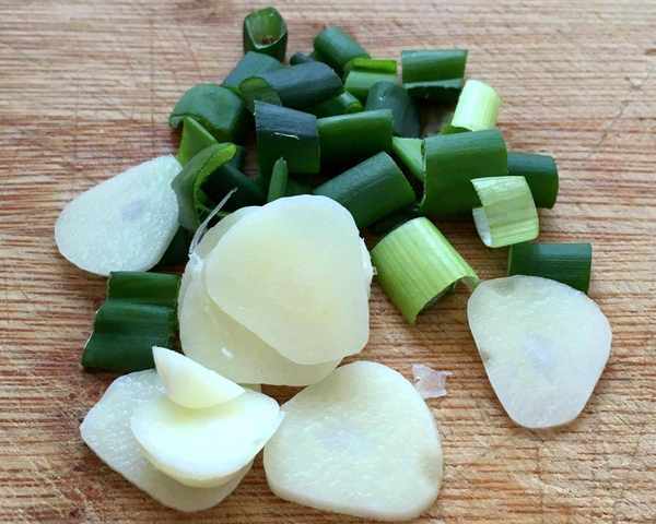 葱、蒜剥去外皮清洗干净分别切成葱花、蒜片备用