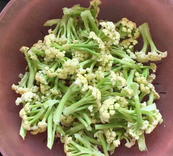 花菜一颗切除粗茎再分成小块,用水浸洗干净后控干水分备用