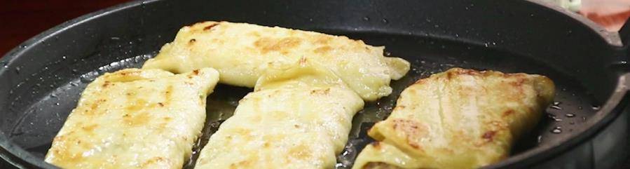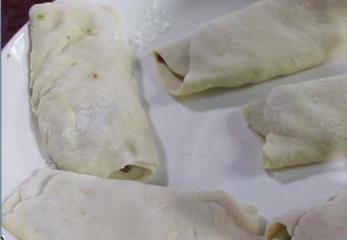 6、 将调拌好的馅料放在面饼上,把面饼向叠被子一样,左一下右一下,折好。