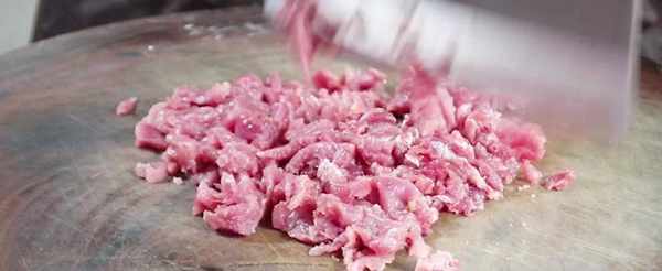 2、 取一小块儿牛肉,先将牛肉切成片,再将牛肉剁成肉沫,装入碗中,备用。