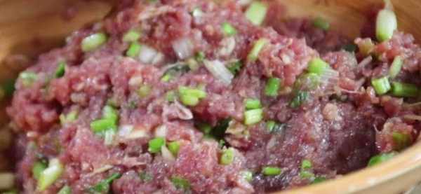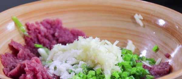 3、 切点葱花,稍微多切一些,这样拌出来的牛肉会更香,将葱花放入装有牛肉馅的碗中,备用。再放入一些切好的姜末,加入少许食用盐、倒点料酒(料酒可以使牛肉馅更加细嫩),加点生抽,放点十三香、孜然粉、花椒粉、胡椒粉搅拌一下,调味。