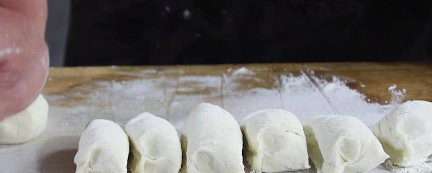 5、 取一案板,将案板上洒一些干面粉,把醒好的面团放在案板上继续揉捏,揉好后搓成长条,分成均匀的几个小剂子,将每个小剂子按扁,用擀面仗将小剂子擀成面饼。