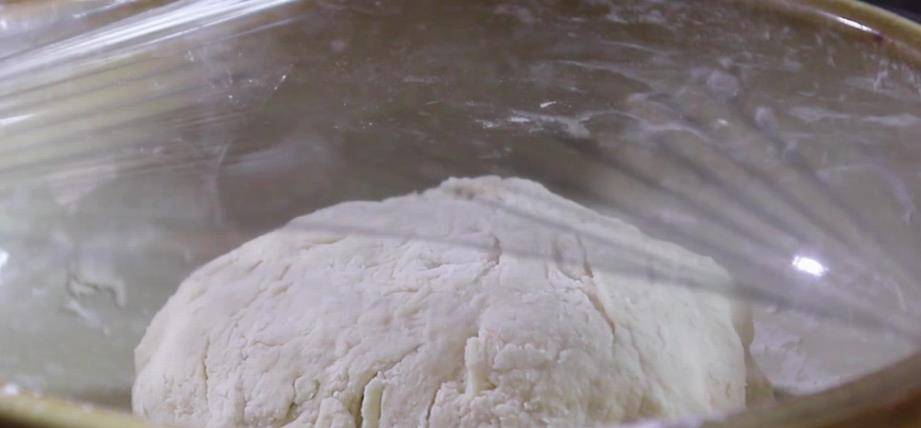 1、 碗中加入大约三百克面粉,加入适量冷水,先用筷子搅拌,搅拌均匀后,上手将面粉揉捏成面团(揉的时间越长,面团越有筋性),揉捏成光滑的面团后,盖上一层保鲜膜,备用。