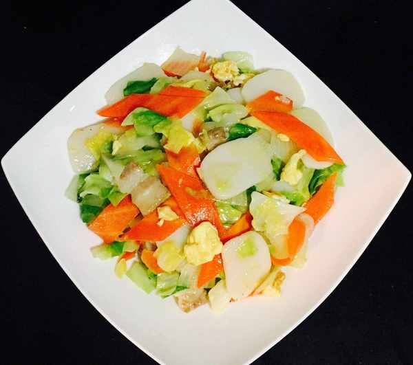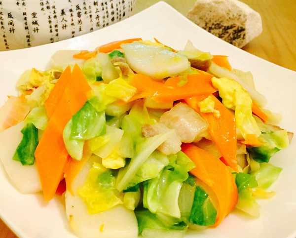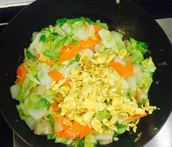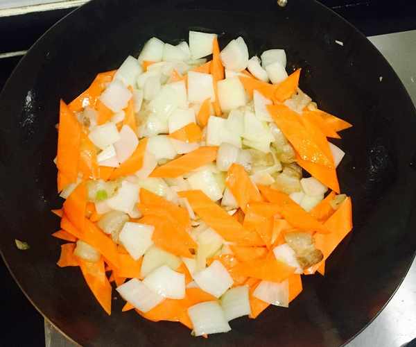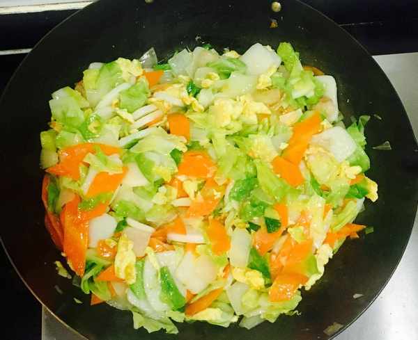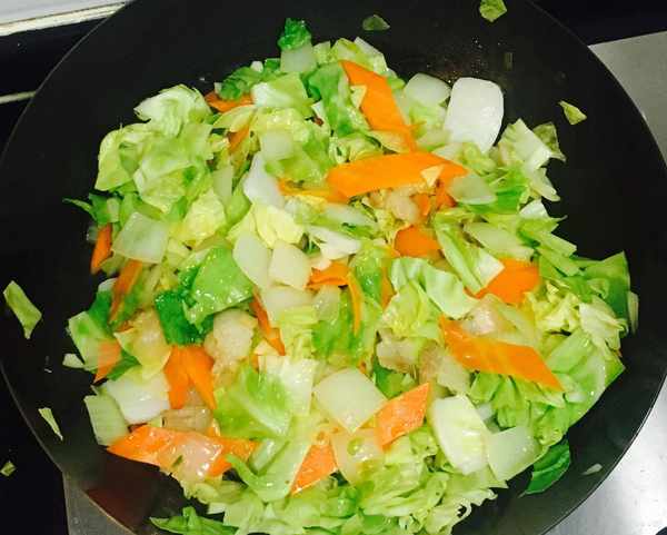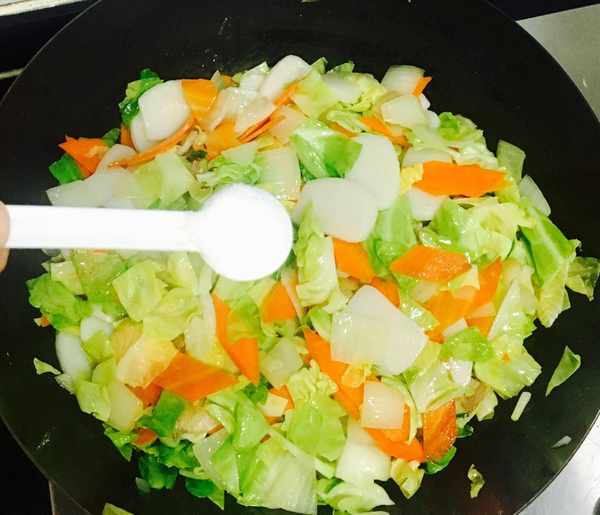 先倒入胡萝卜片和洋葱块翻炒至变软,再倒入卷心菜和年糕加适量的盐翻炒均匀
