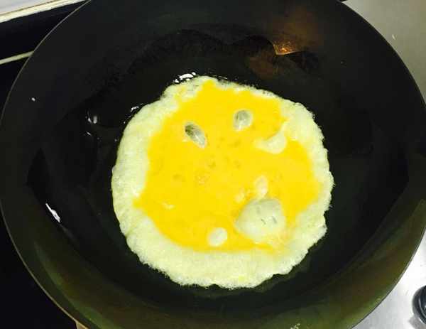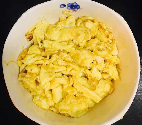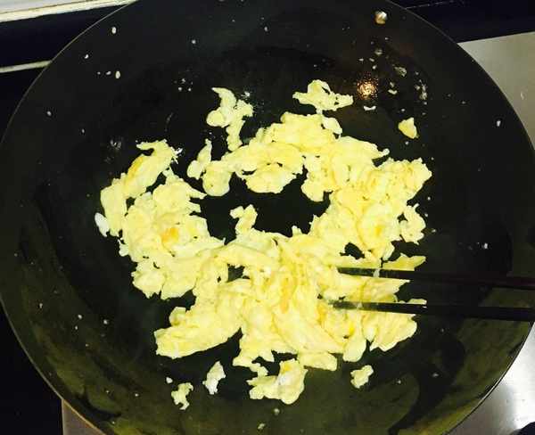 热锅加入适量的花生油,倒入鸡蛋液稍微凝固后用筷子滑散,炒出香味盛入碗中备用
