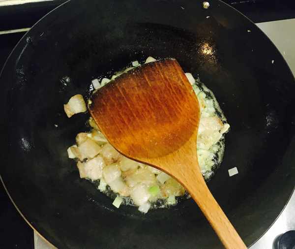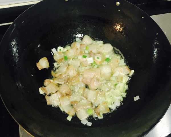 炒完鸡蛋的锅中直接加入适量的花生油,把五花肉片炒出香味并且出油,葱花、蒜片爆香,烹入少许料酒
