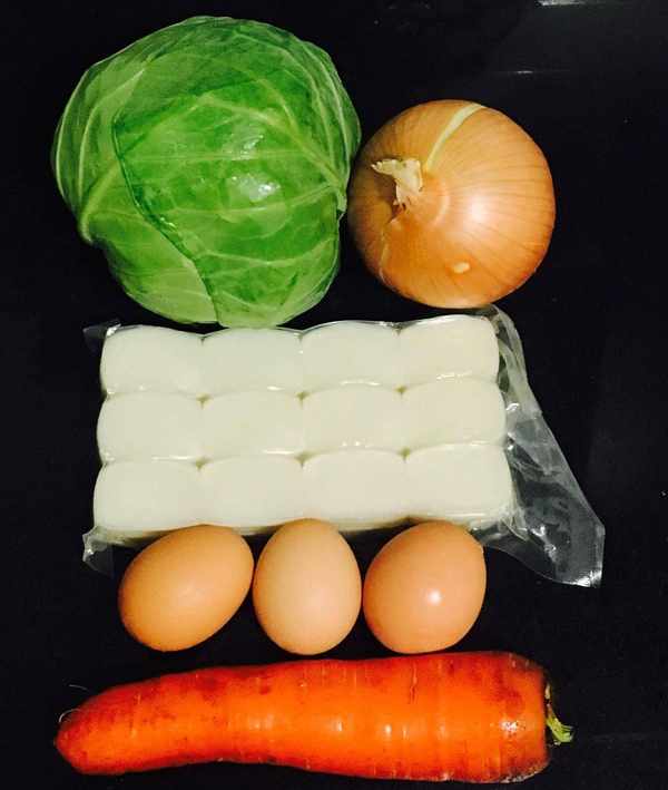 首先准备好炒年糕所需要的材料:卷心菜,洋葱,年糕,鸡蛋,胡萝卜