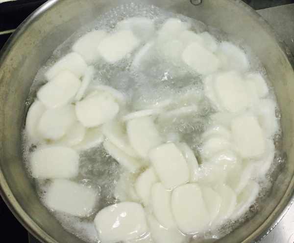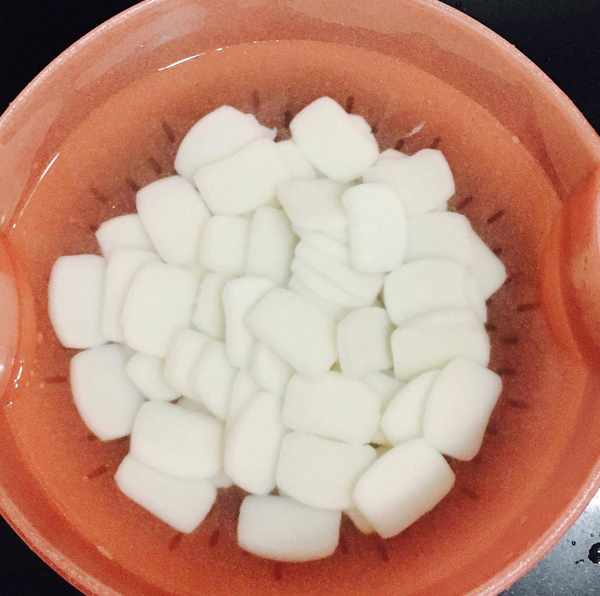 把年糕掰成单块,锅中加水煮沸放入掰好的年糕煮制3分钟,捞出过凉水沥干水分备用