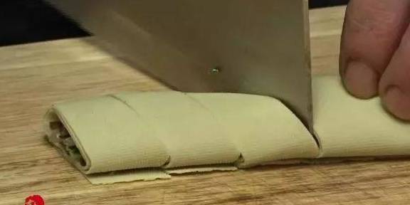 6卷起来,先卷一头,卷完可以用菜刀压一下固定,再接着卷其他部位的,卷好之后,用刀斜切,切成菱形状,摆入盘中