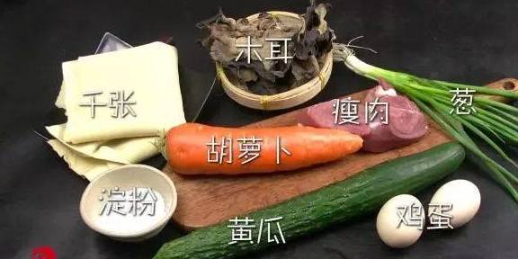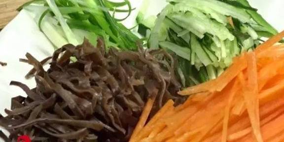 4木耳泡发沥干水份切成细丝,黄瓜、胡萝卜等佐料也切成细丝备用