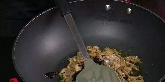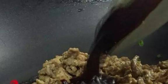 8另起锅,放入少许油,放入葱末煸香后,放入肉丝翻炒,加入两勺甜面酱