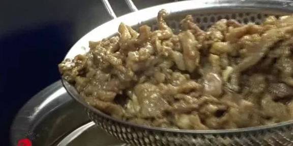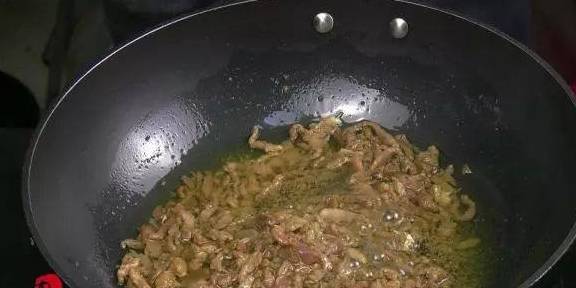 7油烧至五成热,放入肉丝,不断搅拌,油温不要太高,肉丝容易粘连到一起,滑熟后捞出控油