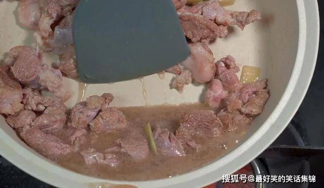 5.起锅烧油,油热倒入姜片爆香,再倒入牛腩,倒入料酒去腥,开大火煸炒,炒干水分。