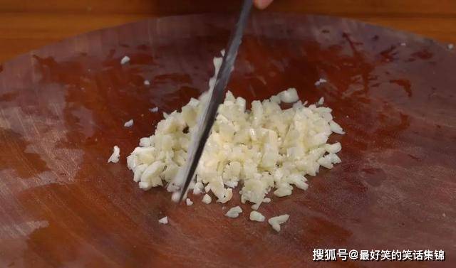 4.下面切一些配菜,先将大蒜拍扁,再切成蒜末。
