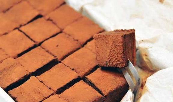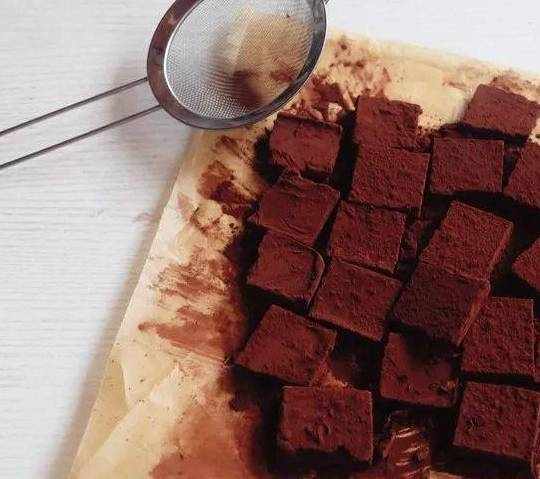 ③冷藏完毕的巧克力已呈现凝固状,即可将烘焙纸连同巧克力一同从容器中取出。表面筛上无糖纯可可粉,将四边不规则状切除后,再逐一切成1.5cm大小容易入口的方块状,切面再均匀筛上无糖纯可可粉。