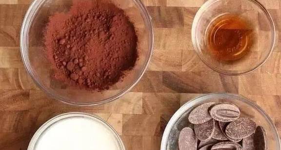 --黑巧克力200g、动物淡奶油100g(乳脂肪含量35%以上)、无糖纯可可粉适量、深色朗姆酒1大匙、可省略或是使用白兰地、橙酒、威士忌取代