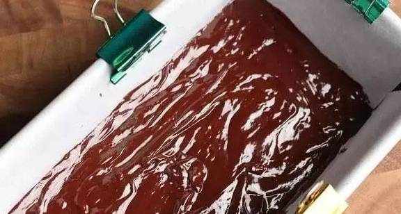 ②取一个四方形/长方形的容器(任何材质皆可,不需要耐热,因为巧克力酱温度不高),里面铺上烘焙纸。倒入已融化均匀的巧克力酱,稍微轻摔数下整平表面后放入冰箱冷藏2小时定型。