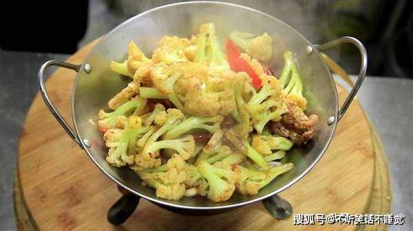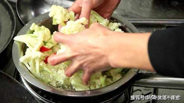 烧热至5成热,油面微冒青烟,把花菜倒入锅内,快速过一下油,时间控制在1分钟以内。