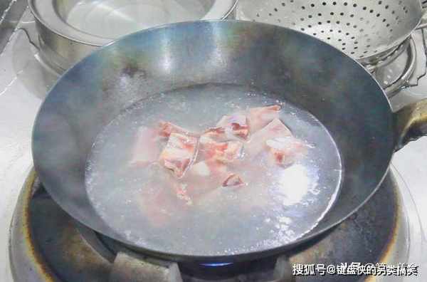 锅里烧开水,排骨凉水下锅,加入一勺料酒,水开后煮一分钟。撇去上面的浮沫,捞出后用水再冲洗干净血末子。