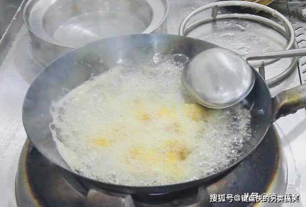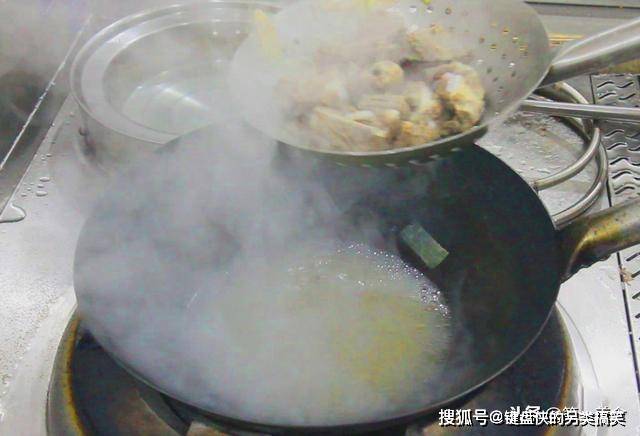 锅内倒入植物油,油烧至五成热,放入排骨,这个过程,一直要保持中火,在整个炸制过程可能持续3分钟。