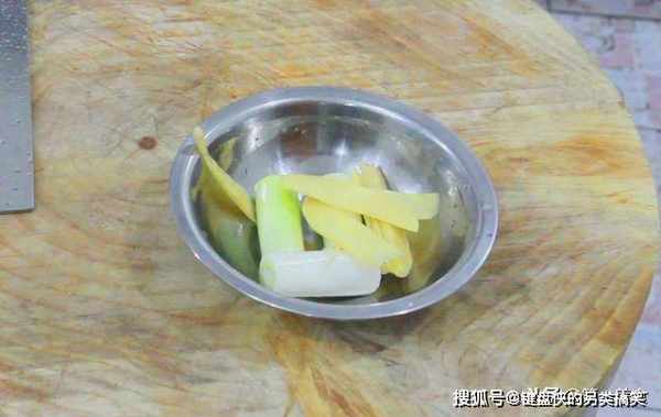大葱白切成三段。生姜一块切几片姜片。